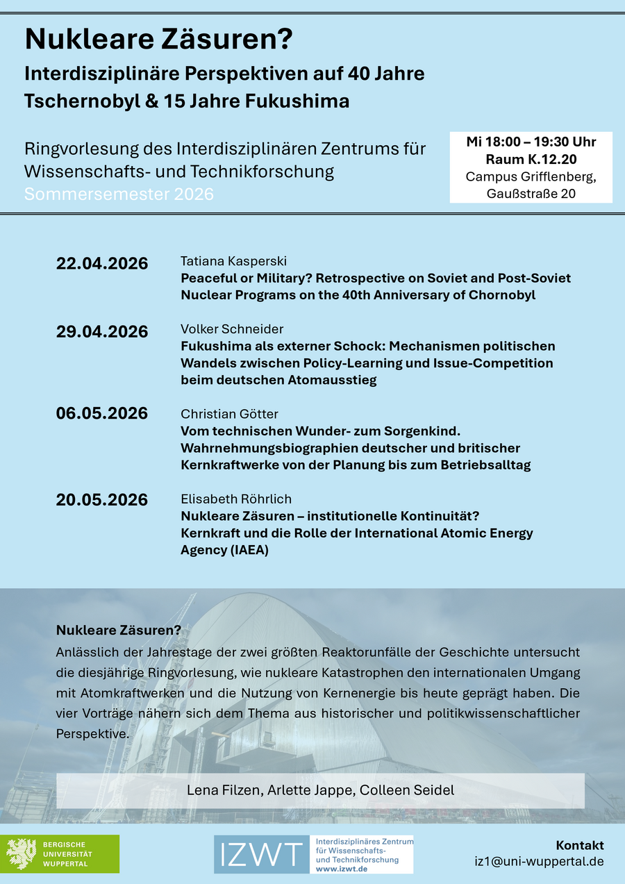 The four lectures approach the topic from different perspectives: From a historical perspective, they will look at the development of Soviet nuclear policy from armament to "peaceful" use, at social perceptions in dealing with ageing nuclear power plants in the UK and Germany, and at the possibilities and limitations of the IAEA as an international organisation in dealing with nuclear safety. From a political science perspective, the focus is on the German nuclear phase-out after Fukushima and the question of which political mechanisms characterised the reaction in Germany.