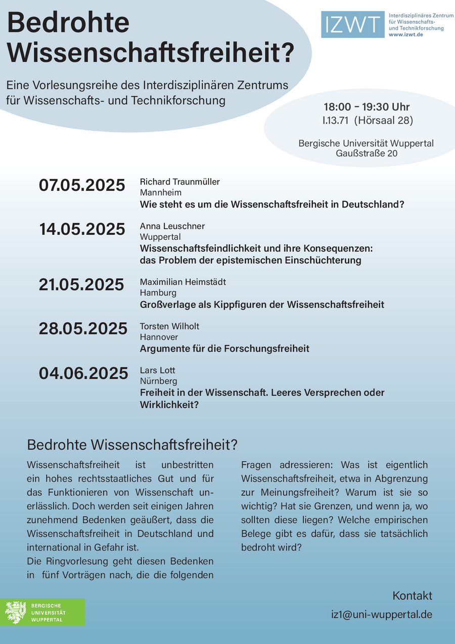 The lecture series takes place every summer semester in addition to the IZWT colloquium and is always dedicated to a specific topic of public interest. In addition to external guests, scientists from the University of Wuppertal also give lectures. The lecture series takes place in the city centre of Elberfeld and is aimed not only at an academic audience but also at interested members of the public.