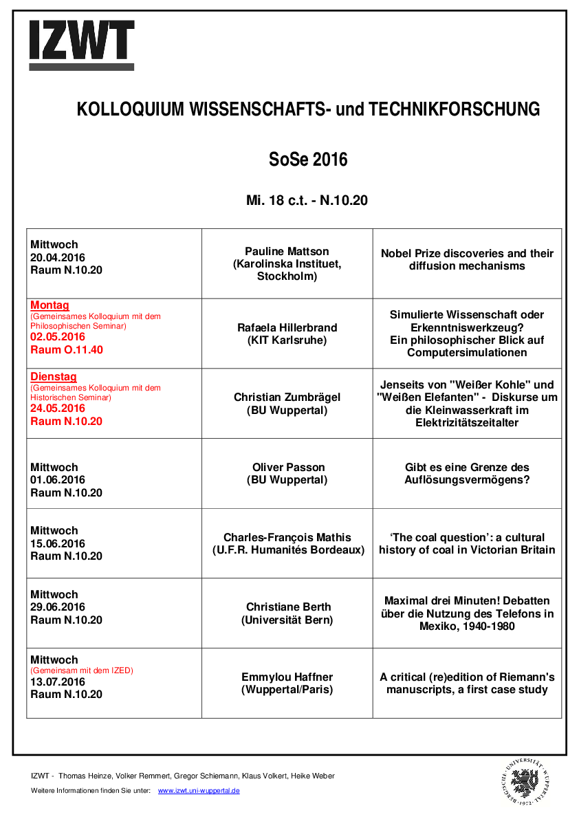 Im Kolloquium werden aktuelle Forschungsthemen aus Wissenschafts- und Technikforschung diskutiert. Die einzelnen Vorträge werden auf Plakaten und mit Aushängen sowie auf der Homepage des IZWT angekündigt. Um Beachtung dieser Informationen wird gebeten.
