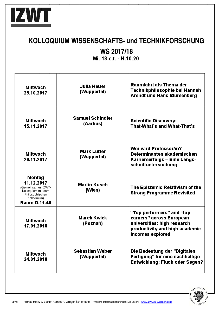 Im Kolloquium werden aktuelle Forschungsthemen aus Wissenschafts- und Technikforschung diskutiert. Die einzelnen Vorträge werden auf Plakaten und mit Aushängen sowie auf der Homepage des IZWT angekündigt. Um Beachtung dieser Informationen wird gebeten.